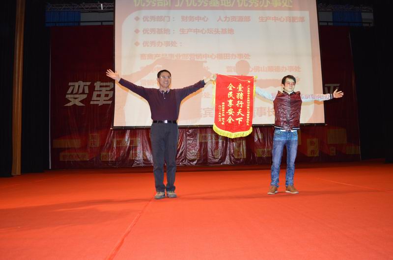 最后,大会对2014年度工作表现突出的优秀员工和优秀部门进行了表彰,对他们过去一年的辛劳和优异表现做出了肯定和鼓励。除了公司给优秀员工颁奖,在表彰大会上,更有来自壹号土猪深圳南办事处的店长胡飞敏给陈董送上“壹猪行天下,全民行安全”的锦旗,感谢陈董为市民餐桌提供健康、美味、安全的壹号土猪肉。