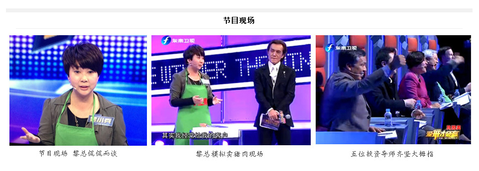 继5月轻松晋级东南卫视《爱拼才会赢》入围赛,6月30日晚黎总再战突围赛,并旗开得胜,成功击败央视“三农人物”老对手巴比馒头老总和爱伲咖啡老总,以绝对优势勇夺陈宏组冠军,冲刺中国好项目。