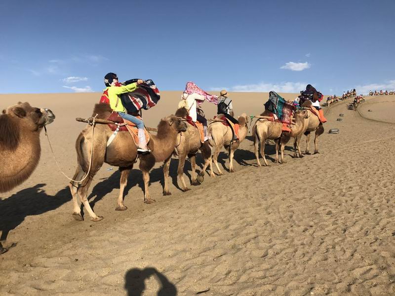 白天,敦煌之旅的壹号人吃着烤全羊,骑着骆驼,在沙漠中感受鸣沙山月牙泉的无限生机;夜幕降临,大家一起在剧院观看《敦煌盛典》的精美绝伦,感受中华悠久灿烂的文化。