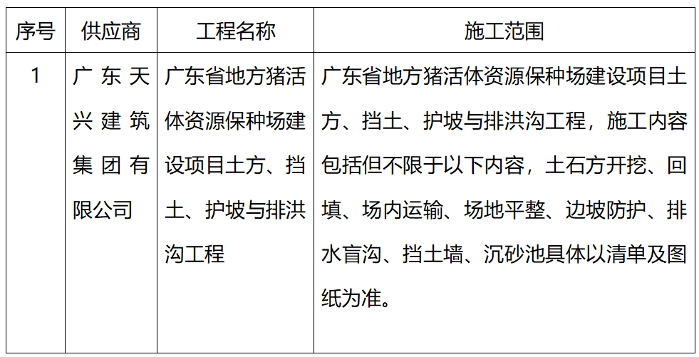 广东省地方猪活体资源保种场建设项目土方、挡土、护坡与排洪沟工程 中标(成交)结果公告