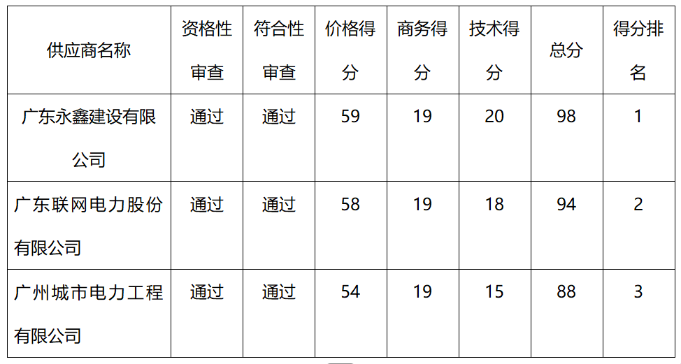 五、中标候选供应商排序表