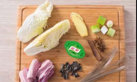 ➀五花肉洗净,切1.5*1.5cm左右的小丁;木耳、粉条用水泡好,备用;白菜洗净切段;