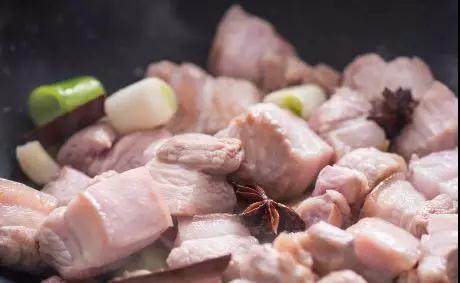 ②放油,加入八角、桂皮、葱、姜、蒜和五花肉一起煸炒,加料酒