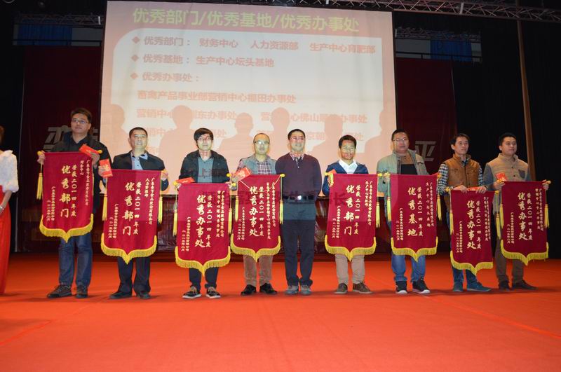 最后,大会对2014年度工作表现突出的优秀员工和优秀部门进行了表彰,对他们过去一年的辛劳和优异表现做出了肯定和鼓励。除了公司给优秀员工颁奖,在表彰大会上,更有来自壹号土猪深圳南办事处的店长胡飞敏给陈董送上“壹猪行天下,全民行安全”的锦旗,感谢陈董为市民餐桌提供健康、美味、安全的壹号土猪肉。