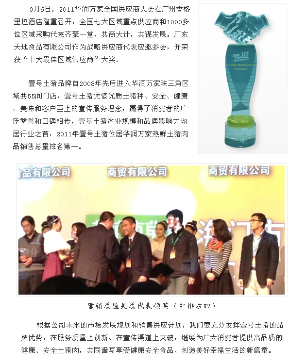 3月6日,2011华润万家全国供应商大会在广州香格里拉酒店隆重召开,全国七大区域重点供应商和1000多位区域采购代表集聚一堂,共商大计,共谋发展。广东天地食品有限公司作为战略供应商代表应邀参会,并荣获“十大最佳区域供应商”大奖。