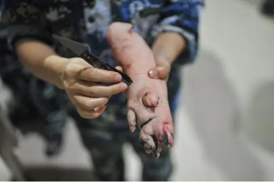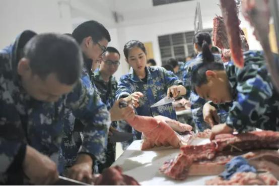 每天凌晨两点,生猪在宰杀后直接送来,一头猪分成两半,黎虹和其他学员需要在两点半出现在案板前,夜黑风高,各种刀具,以及等待分割的猪,这样的场景多少让女生有些胆怯。