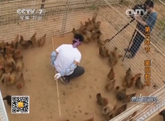 养猪创业选手于兴洋使出了最靠谱的方法,首先用竹竿转着圈数,然后用竹竿把鸡围拢到角落里,一只一只摸着鸡逐一数数。虽然有漏网之鱼,但也八九不离十。