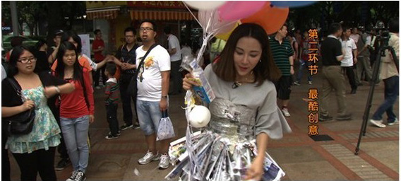 其中,都市白领选手张楠,用报纸和气球装扮自己,以美女火鸡加生猛活鸡的形象吸引一众市民驻足观看。在张楠甜美声音和笑容的感染下,很多小朋友都充满好奇地走上前抱一抱、摸一摸可爱的土鸡。张楠的着装创意着实让人眼前一亮。