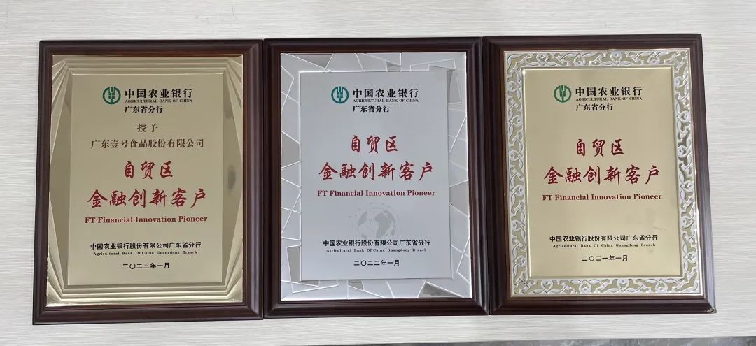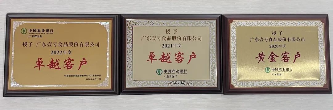 2023年开年工作伊始,农业银行便为壹号食品送来了祝福和荣誉。壹号食品副总裁符友信代表公司再次接过了中国农业银行湛江分行行长授予的中国农业银行广东省分行“卓越客户”和“自贸区金融创新客户”的荣誉牌匾。从2020年农行的“黄金客户”向2021年及2022年“卓越客户”的迈越,标志着壹号食品同农业银行广东省分行的合作进入了新的里程碑。这是壹号食品连续二年荣获农业银行广东省分行“卓越客户”且连续三年荣获“自贸区金融创新客户”称号。